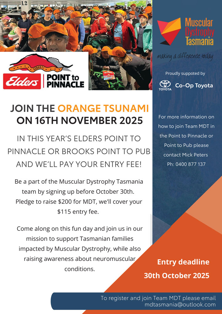 Pledge to raise $200 for Muscular Dystrophy Tasmania and we will cover your $115 entry fee. Sign up by 30 October and be part of something amazing.